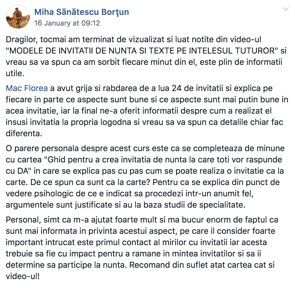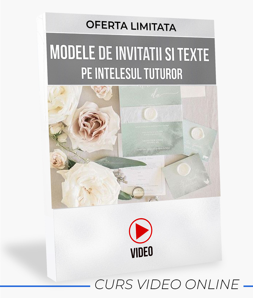 OFERTA VALABILA DOAR ACUM! Poți adăuga cursul video "MODELE DE INVITATII DE NUNTA SI TEXTE PE INTELESUL TUTUROR" la comanda ta. Acest curs vine in completarea cartii si voi oferi din experienta si din „colectia” mea 26 de exemple relevante de texte si modele de invitatii, dupa care sa te ghidezi.